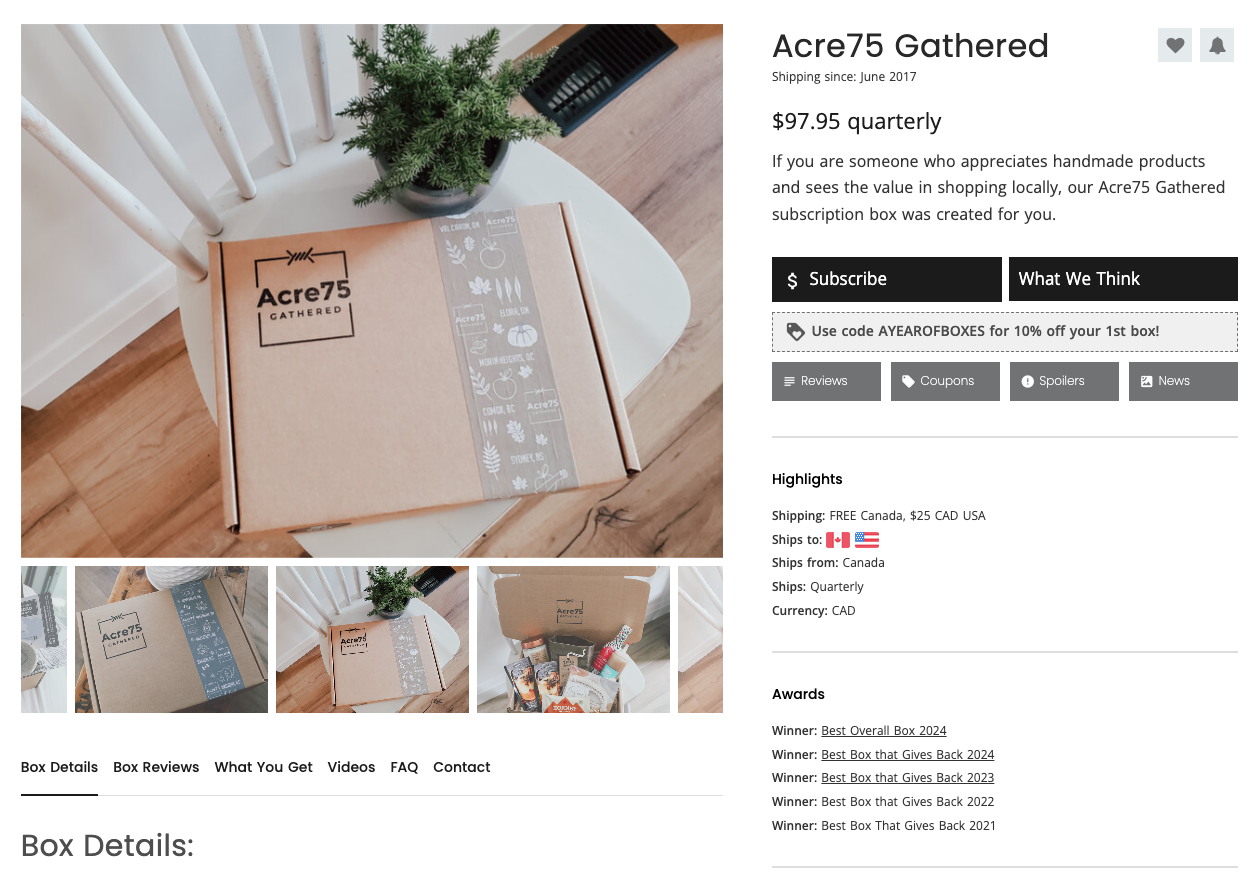 In addition, your listing in our directory will now have a banner across the top displaying your award. Visitors can sort by award winners and use the banner as instant recognition of a trustworthy and reputable box to try. If you need any updates made to your listing in our directory, please reach out to info@ayearofboxes.com and we would be happy to help make any changes for you. We encourage you to have a carousel of at least 5 images and to have your listing up to date with pricing, details, and shipping info.
